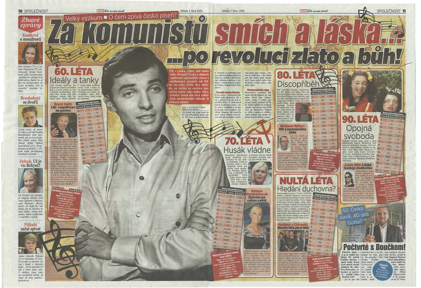 Dvoustrana inspirovaná naším tématem „jak šly roky v hudbě“ vyšla i v deníku Blesk. Autoři článku komentují jednotlivá desetiletí na základě nejčastějších slov, která se objevovala v populárních písních.